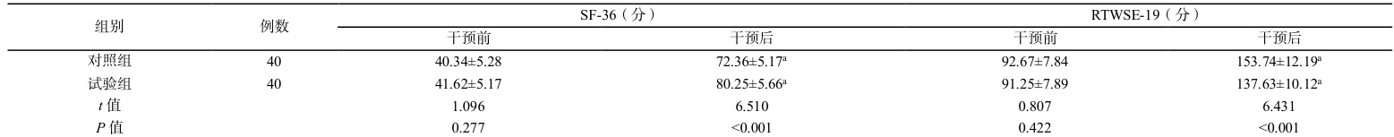 )。干预后,两组 SF-36 量表和 RTWSE-19 量表得分高于干预前,试验组得分更高,差异均有统计学意义( P<0.05) (表 5)。