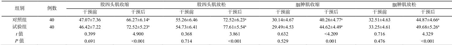 干预前,两组患者股四头肌收缩、放松、腘胂肌收缩、放松状态下肌电信号值比较,差异无统计学意义( P>0.05 );干预后,两组肌电信号值均低于干预前,试验组水平更高,差异有统计学意义( P <0.05 )(表 1)