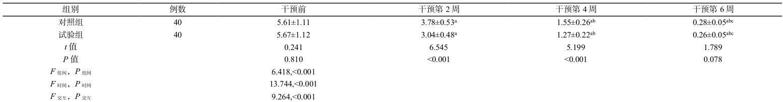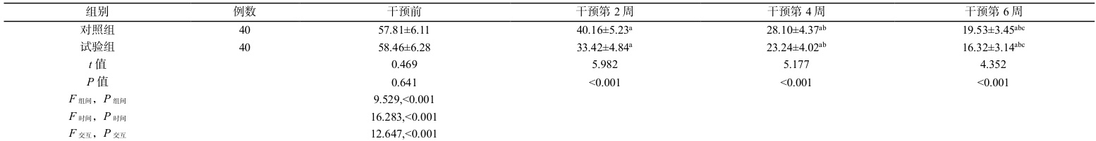 干预前,两组 SAS 评分比较差异无统计学意义( P>0.05)i 。干预后 6 周内,两组 SAS 评分逐渐降低,试验组评分更低,差异均有统计学意义( P<0.05 )(表 3)。