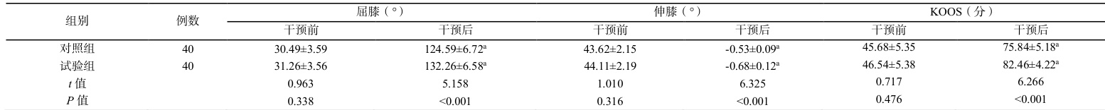干预前,两组患侧膝关节屈膝和伸膝 AROM 及 KOOS 得分比较,差异无统计学意义( P>0.05 )。干预后,两组屈膝和伸膝 AROM 及 KOOS 得分高于干预前,试验组 AROM 及 KOOS 得分更高,差异有统计学意义( P<0.05) )(表 4)。