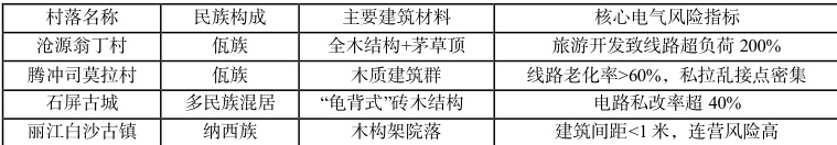 随着旅游业发展,用电负荷激增与线路老化形成“隐形火源”:线路老化率达 60% 以上:腾冲司莫拉佤族村 500 年历史的建筑中,绝缘层脆化开裂现象普遍,私拉乱接电线现象突出;负荷激增缺乏监管:翁丁村火灾前已因旅游开发导致线路超负荷运行,但缺乏实时监测手段。