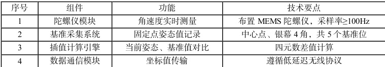 (1)开发枪械坐标采集软件。按照模块化设计方式,布置软件系统组件,主要包括陀螺仪模块、基准采集系统、插值计算引擎、数据通信模块,如表 1 所示。