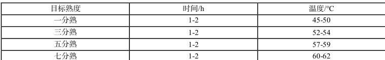 由图 1 可知,肉类选择是低温慢煮工艺开展的第一步,可优选纤维较粗、需提升难度的牛肋条、牛腩、牛腱等部位的牛肉。在选定肉类后,根据需要切除牛排边缘的筋膜、脂肪,并处理为 1.5cm-3cm 厚的牛排,牛排根据加工口味要求提前 15min-60min 腌制。预处理后,借助真空密封机遇真空袋,抽真空密封,确保密封后牛排按压无气泡。最终,放入低温慢煮机或带温控的恒温控水浴锅,进行精准控温控时,不同熟度对应水浴加工温度和时间见表3。
