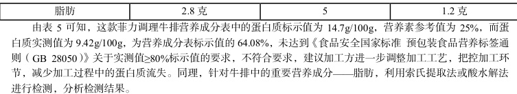 表5 某款菲力调理牛排营养成分标值与实测值(局部)