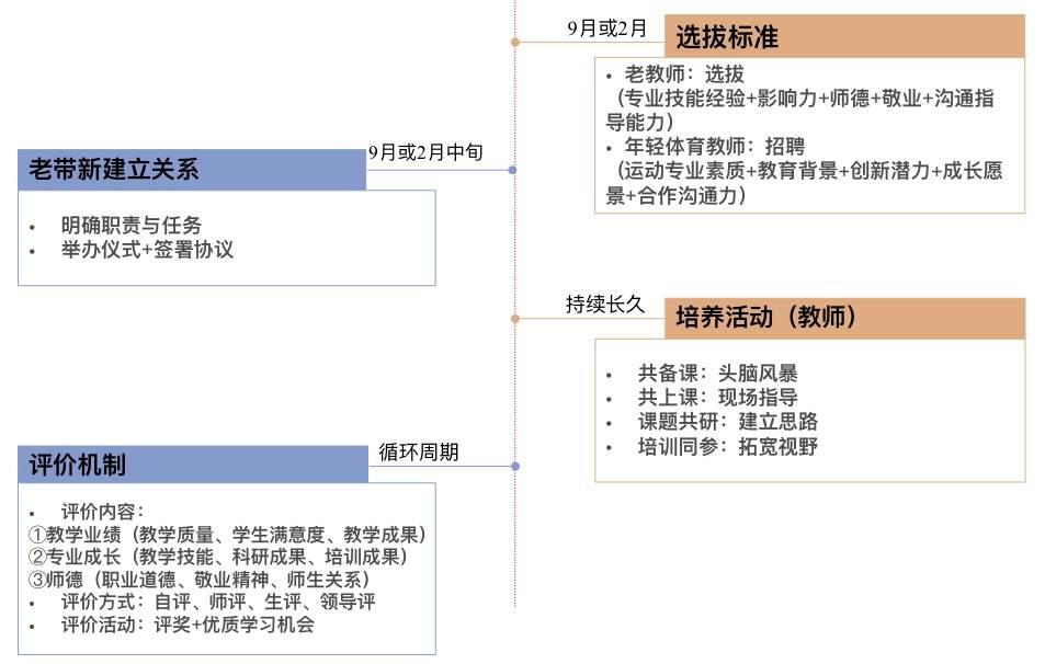 为了保障该培养模式的顺利开展,本研究以当前学校体育教育教学所涉猎的工作任务为依据,列举出“1+1 老带新”双方职责。其中,老教师的职责包括:指导年轻体育教师制定教学计划、备课、上课、评价学生等;带领年轻体育教师学习新的教学理念,接触新兴项目,传授教学经验和专业技能;帮助年轻体育教师解决学校工作中遇到的问题和困难;定期对年轻教师的课程教学进行评价与反馈。而年轻体育教师的职责包括:尊重老教师,虚心向老教师请教,学习新的教学理念、教学经验和专业技能;积极参与学校体育活动的组织工作和教学实践,不断提高自己的工作水平。