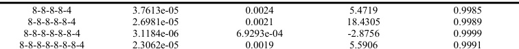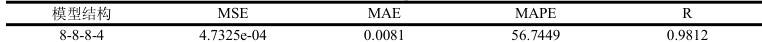 从表3.1 的仿真结果可以看出,随着网络结构深度的增加,模型的识别精度变高,但当模型结构深度达到8层时,性能指标有所降低,由此确定网络模型结构为7 层,最终得出了MLP 板形识别模型最优结构,各层节点数为[8-8-8-8-8-8-4],其性能指标 MSE 的数量级也达到了 10-6。