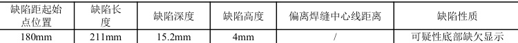 从底片上,见到一条长 210mm,有一定宽度的黑色影像,经分析,可判定为管道内表面凹槽或局部减薄所造成的内表面缺欠,不属焊缝内埋藏缺陷,也不属内表面开口缺陷。