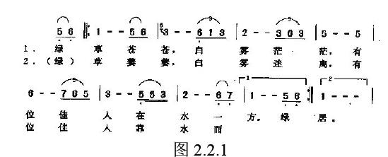 这一段是 A 段,是呈示部,以起、承、转、合的形式展开,开头为弱起,这首歌开头十分低沉,速度比较和缓,很好的融入了歌曲的感情。但曲调的起伏却很大,比如绿草、白雾、苍茫、苍茫,音调相差了一个八度,作曲家的意图就是为了凸显后一种孤独和寂静。“转”段与“有位佳人”相呼应,曲调起伏平缓,音高也比较高,表现出对佳人的向往。这一部分以主音 G 结尾,有“合”的效果。这里介绍了开始的场景,也是一个铺垫。在谱例 2 中可以看到: