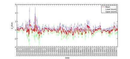 本文在窗口滚动过程中选择子样本,对每个子样本进行估计,然后计算估计的 bootstrap-p 值。图 2 和图 3显示了 EG 对 MU 的影响程度和方向。原假设为EG 不是 MU 发生变化的格兰杰原因,可以看到,在10%显著性水平下被拒绝的子样本区间大致分布在 2014M11-12、2015M05、2015M08-10、2016M02、2016M06-09、2018M07-11、2019M02-04、2019M07-09、2020M01、2020M05-07、2020M09-11、2021M07、2021M09、2022M09。2015M05-09 期间,EG 对 MU 的影响是先产生负向作用后出现正向作用。在2016M02-06 期间,EG 对 MU 先是产生了明显的正向作用,后出现了明显的负向作用。此外,在2020M05-07 期间,可看出EG 对MU 产生了明显的正向作用,同样的正向作用也体现在2022M09 期间。