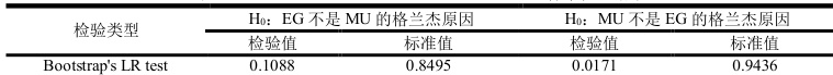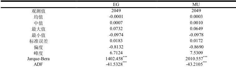 表 1 可以看出 EG 和 MU 的均值分别是-0.0001 和 0.0003。此外, EG 和 MU 的偏度都不为 0,EG 和 MU都向左偏。EG 和MU 的峰度分别为6.7124 和7.5309,EG 和MU 峰度值都大于3,表示这两个变量都呈尖峰分布。然后从 Jarque-Bera 统计量的检验结果表示,EG 和 MU 在 1%的显著水平下显示是非正态分布。ADF 检验结果可知,EG 和MU 在1%的显著水平下显示平稳,因此可以进行如下检验。