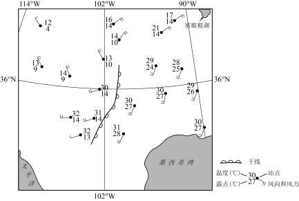 真题呈现:露点是空气因冷却而达到饱和时的温度,其数值越大,反映空气中水汽含量越大。一般情况下,温度相同时湿空气要比干空气密度小。两个温度相近的干、湿气团相遇所形成的锋,称为干线。下图为北美洲部分地区某时刻主要气象要素分布形势示意图,来自极地、太平洋和墨西哥湾的三种性质不同的气团,在落基山以东平原地区交绥形成三个锋:冷锋、暖锋和干线。