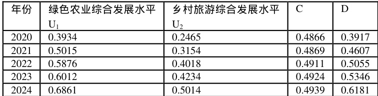 表3 团风县2020-2024 年绿色农业与乡村旅游耦合协调度计算结果
