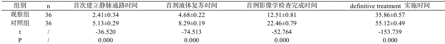 观察组 多学科协作团队参与的急救路径管理,内容包括:由急诊科牵头,联合外科、重症医学科、麻醉科、放射科及护理团队等多学科人员组成协作团队,明确分工,急诊医生负责总体病情评估与决策,护理团队负责快速静脉通路建立与监护,外科及麻醉科同步准备手术,放射科优先安排影像学检查,检验科开通“绿色通道”,以确保抢救流程无缝衔接。患者到达急诊后由团队共同完成快速病情评估,实施 ABCDE 原则(气道、呼吸、循环、神经系统、全身暴露)检查,并根据病情严重程度立即启动创伤性休克急救路径。该团队急救模式强调多环节并行处理:一组人员建立静脉通路并启动液体复苏,另一组同时进行气道管理,外科医生同步进行创伤部位止血处理,而放射科和检验科提前准备以缩短检查时间,从而实现流程优化。急救过程中,各学科通过信息化系统与床旁沟通实现病情信息、检查结果和治疗方案的实时共享,避免交接延误,并能根据团队会诊结果快速做出治疗决策,如急诊手术、介入止血等,相关科室提前做好准备,显著缩短 definitive treatment 实施时间。