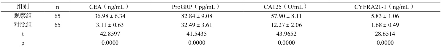 选取如东县中医院2023.12~2024.12 接收的 65 例肺癌患者作为观察组,同期选取65 例肺部良性病变患者作为对照组。(1)观察组。男37 例,女 28 例;年龄 40~65( 58.79±4.26 )岁。(2)对照组。男 33 例,女 32 例;年龄 38~65( 58.28±4.13 )岁。两组一般资料无显著差异( p>0.05 )。