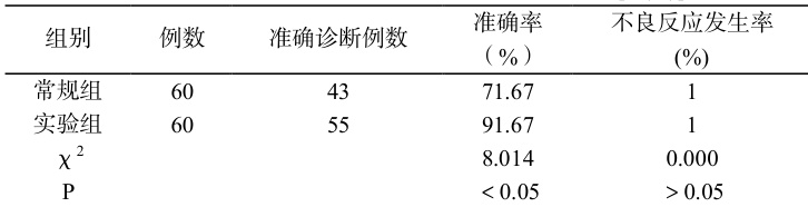 实验组的诊断准确率显著高于常规组,比较 P<0.05 ;两组不良反应发生率相近,比较 P>0.05 (见表 1)。