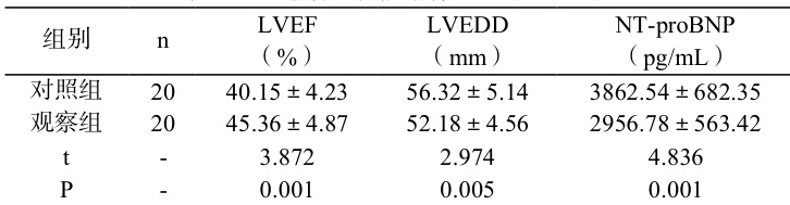 如表 1 所示,治疗结束后,观察组左室射血分数(LVEF)较对照组显著提升,左心室舒张末期内径(LVEDD)及 N 末端 B 型利钠肽前体(NT-proBNP)水平则低于对照组,差异具备统计学价值( P<0.05 )。