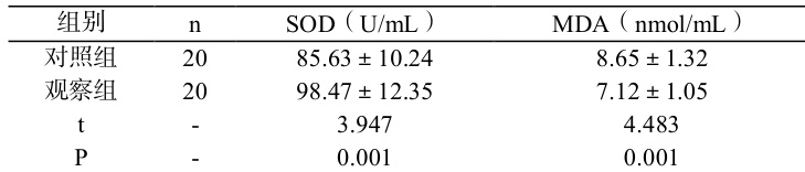 如表 2 所示,在治疗结束后,实验数据显示观察组患者的 SOD 活性较对照组显著提升,同时 MDA 水平呈现明显下降趋势,两组比较差异具有统计学意义( P<0.05 )。