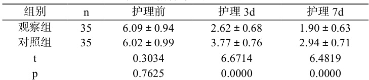 两组护理前的 VAS 评分无显著差异( p>0.05 ),护理 3d、7d 观察组显著更低( p<0.05 )。见表 1。