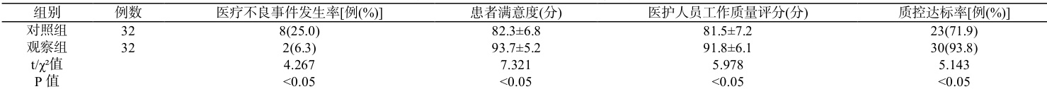 与对照组相比,观察组在降低医疗不良事件发生率方面成效显著,同时在提升患者满意度、优化医护人员工作质量及提高质控合格率方面均取得了显著进展,统计学差异明确( P<0.05) 。见表 1。