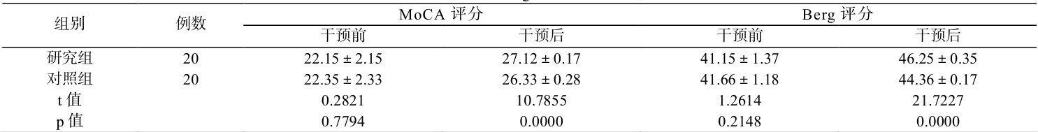 如表 1 所示,研究组 MoCA 评分以及 Berg 评分均高于对照组( P<0.05 )。