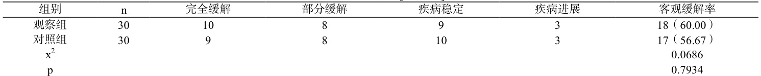 观察组客观缓解率显著更高( p<0.05 ),见表 1。