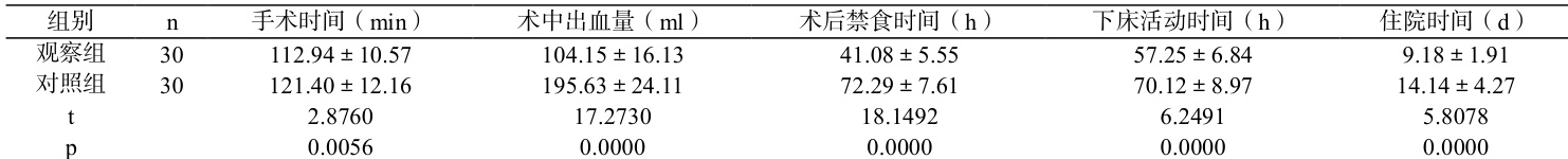 (2)手术指标。手术时间、术中出血量、术后禁食时间、下床活动时间、住院时间