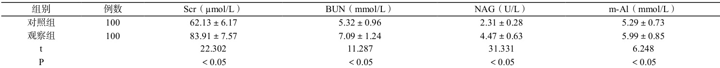 观察组 Scr、BUN、NAG、m-Alb 高于对照组,差异显著( P<0.05 ),见表 1。