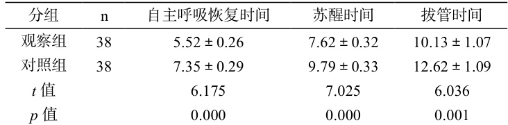 观察组下述各项复苏时间均短于对照组, ① 自主呼吸恢复时间、 ② 苏醒时间、 ③ 拔管时间,差异均有统计学意义( P<0.05 )。