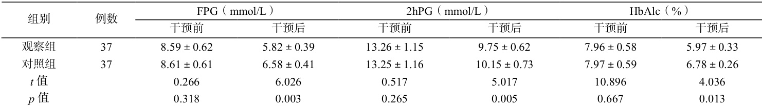 干预前两组 FPG、2hPG、HbAlc 差异小( P>0.05 ),干预后观察组FPG、2hPG、HbAlc 均低于对照组( P<0.05 )。