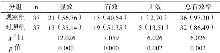 观察组总有效率 97.30% ,对照组 86.49% ( P<0.05 )。