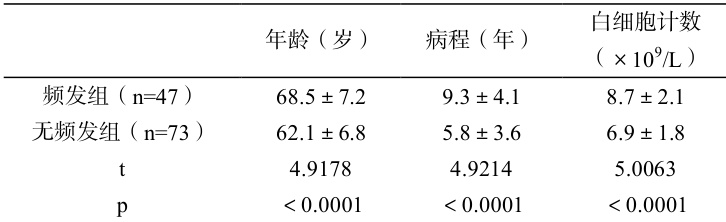 频发组患者的年龄更高,病程更长,白细胞计数更高,差异具有统计学意义( ρP<0.05 )。详见表 1: