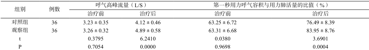 对比两组肺功能指标,治疗前,无明显差异( P>0.05 ),治疗后,观察组各方面指标更高( P<0.05 ),如表 1。