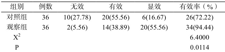 观察组治疗有效率高于对照组( P<0.05 ),如表 2