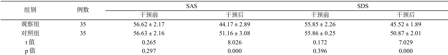 干预前各组SAS、SDS 均高( P>0.05 ),干预后观察组的SAS、SDS 评分均低于对照组( P<0.05 )。