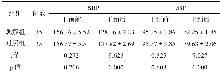 干预前两组 SBP、DBP 差异小( P>0.05 ),干预后观察组 SBP、DBP均低于对照组( P<0.05 )。