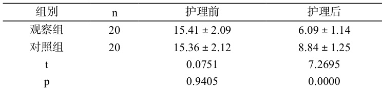 两组护理前的 TCSS 评分差异不显著( p>0.05 ),护理后为观察组显著更低( p<0.05 )。见表 1。
