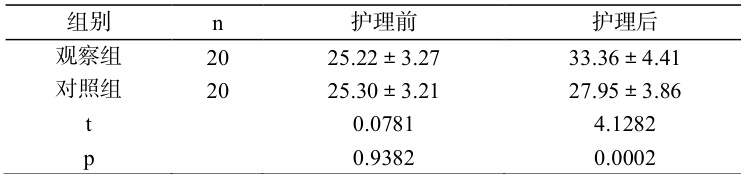 两组护理前的 GSES 评分差异不显著( p>0.05 ),护理后为观察组显著更高( p<0.05 )。见表 2。