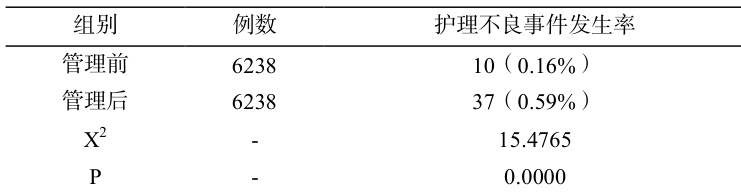 本文分析显示,管理后风险拦截 83 次,护理不良事件发生率低于管理前 (P<0.05) 。其原因为:以科学理论为指导,识别临床护理中的风险点,进行系统的循证证据检索和转换,形成风险管理清单,构建护理风险管理信息平台,可以提高服务效率和质量,有效降低护理不良事件的发生率,对护理风险管理提供指导及参考,实施价值高。但这项研究也有一些局限性。例如,同一种药物或护理程序在不同情况下或不同患者之间可能有不同的风险点。然而,本研究中的风险点相对单一,未能反映个体差异。此外,这项研究耗时长、成本高、成本高。在未来的研究中,可以增加更多的评价指标,并进行分步实验设计,不断探索应用效果。