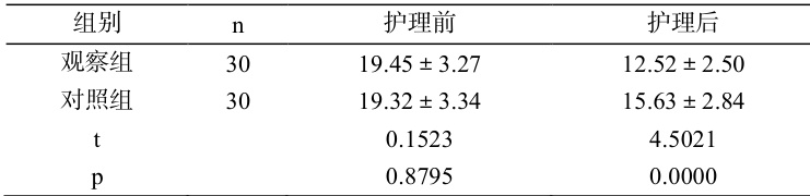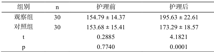 两组护理前的 NOSIE-30 评分差异不显著( p>0.05 ),护理后为观察组显著更高( p<0.05 )。见表 1。