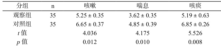 观察组下述症状的缓解时间短于对照组, ① 咳嗽、 ② 喘息、 ③ 咳痰( P< 0.05)。