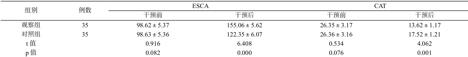 干预前两组ESCA、CAT 评分差异小( P>0.05 ),干预后观察组ESCA 评分高于对照组,CAT 评分低于对照组( P<0.05) 。