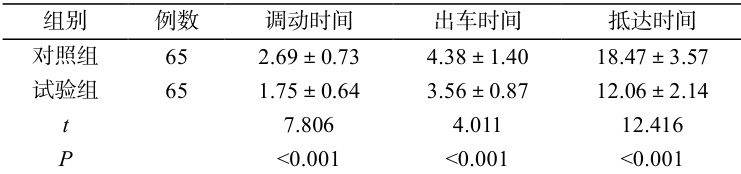 试验组的平均调动时间、出车时间和抵达时间统计结果均显著短于对照组患者( P<0.05)