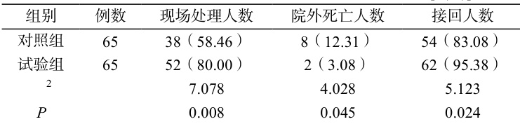 试验组现场处理人数及接回人数占比均高于对照组,院外死亡人数占比明显低于对照组( P<0.05 )。详见表 2: