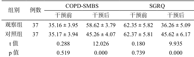 干预前两组 COPD-SMBS、SGRQ 评分差异小( P>0.05 ),干预后观察组 COPD-SMBS 评分高于对照组,SGRQ 评分低于对照组( P<0.05) 表 1 两组 COPD-SMBS、SGRQ 评分比较(
