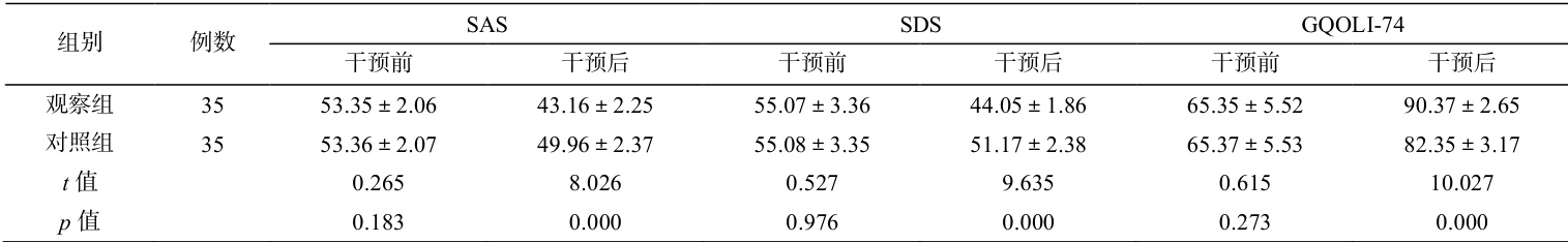 干预前两组 SAS、SDS、GQOLI-74 评分差异小( P>0.05 ),干预后观察组 SAS、SDS 评分均低于对照组,GQOLI-74 评分高于对照组( P< 0.05)。