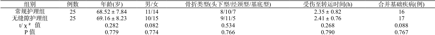 选取2022 年1 月至2023 年12 月期间需院前转运的股骨颈骨折患者50 例,根据护理方式分为无缝隙护理组和常规护理组,每组 25 例。