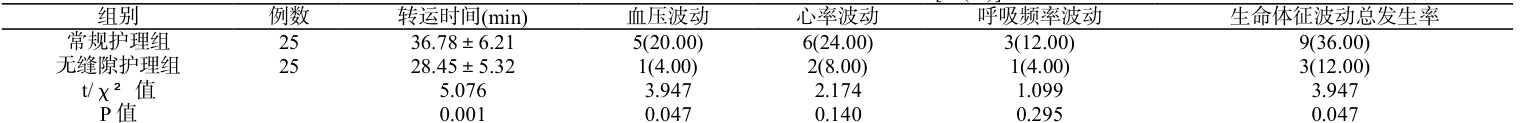 无缝隙护理组转运时间明显短于常规护理组,生命体征波动发生率显著低于常规护理组。见表 2