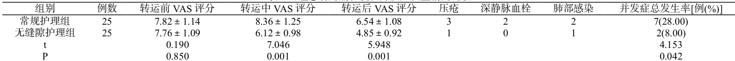 无缝隙护理组在转运各时间点的疼痛评分均低于常规护理组,并发症发生