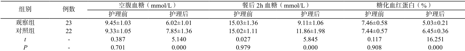 护理前,两组血糖指标结果相近( P>0.05 );护理后,观察组的各项数值均更低于对照组( P<0.05 )。由表 1 所示。