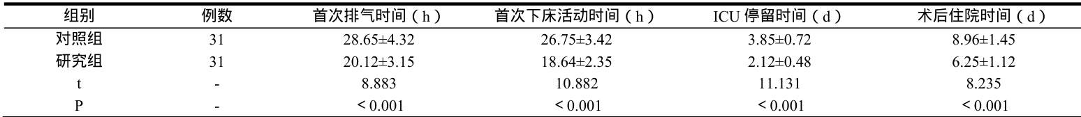 研究组实施基于ERAS 理念的集束化护理干预(1)术前阶段:在手术前 2 小时,患者需口服专门配制的碳水化合物清饮料,该饮料经过精心调配,既能满足术前能量需求,又不会增加误吸风险;由心脏外科医师、麻醉医师、康复师、营养师和心理医师组成的多学科团队会对每位患者进行全面评估,根据评估结果制定个体化的术前准备方案,针对患者常见的焦虑和恐惧情绪,护理团队会开展一对一的情绪疏导和心理支持,采用认知行为疗法帮助患者建立积极的手术预期,同时,患者需要接受系统的呼吸功能训练指导,包括腹式呼吸、有效咳嗽和深呼吸等技巧,每天练习3 次,每次15 分钟,持续至手术前日。(2)术中管理:手术过程中采用精确的目标导向液体管理策略,通过血流动力学监测设备实时评估患者容量状态,严格控制输液速度和液体种类;使用充气式加温毯、液体加温仪和调节手术室温度等多种手段维持患者核心体温在 36∘C 以上;制定严格的输血指征,血红蛋白高于 80g/L 且血流动力学稳定的患者不予输血,确需输血时优先考虑成分输血。(3)术后康复:术后疼痛管理采用阶梯式多模式镇痛方案,根据医生的指导,提供切口局部浸润麻醉、非甾体抗炎药和阿片类药物的合理搭配,确保在有效镇痛的同时尽量减少阿片类药物用量;术后活动计划明确分为三个阶段:术后6 小时开始指导患者在床上进行肢体被动活动,术后 12 小时协助患者取半坐卧位并在床边坐起,术后 18 小时在医护人员监护下完成首次下床站立;肠内营养支持在术后 6 小时即开始实施,先给予少量温开水,确认无不适后逐步过渡到肠内营养制剂;每日晨间由主管医师、护士长和康复师共同查房,根据患者当日生命体征、实验室检查结果和功能状态调整康复目标和具体措施。